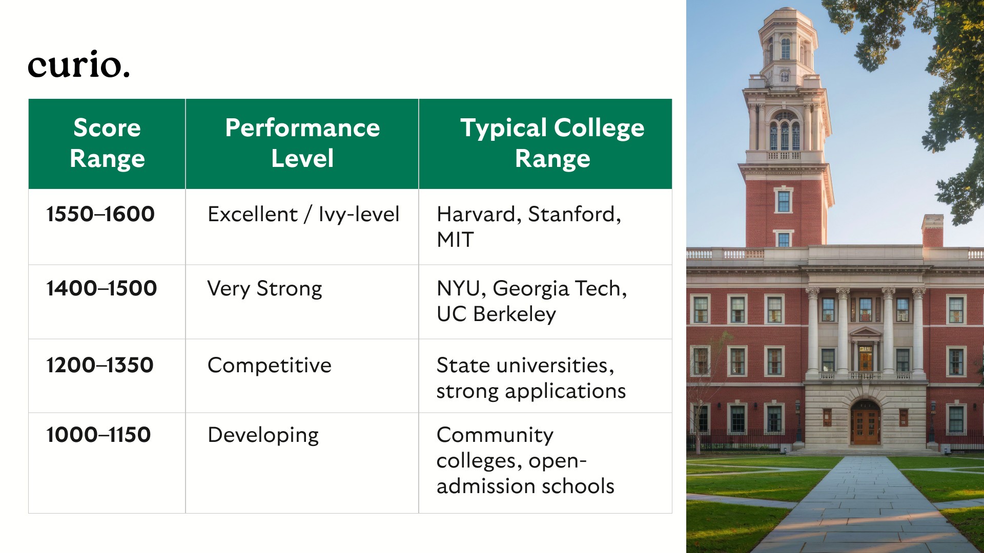 These ranges reflect commonly accepted benchmarks but vary by institution. Remember that colleges look at more than test scores — your GPA, essays, and extracurriculars all matter. Still, a higher SAT score can strengthen your application and open scholarship opportunities.