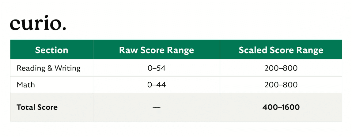 Your total SAT score is the sum of your two section scores. Each section starts at 200 and goes up to 800. The approximate question counts and scoring range align with official specifications. Minor variation in question count might occur.